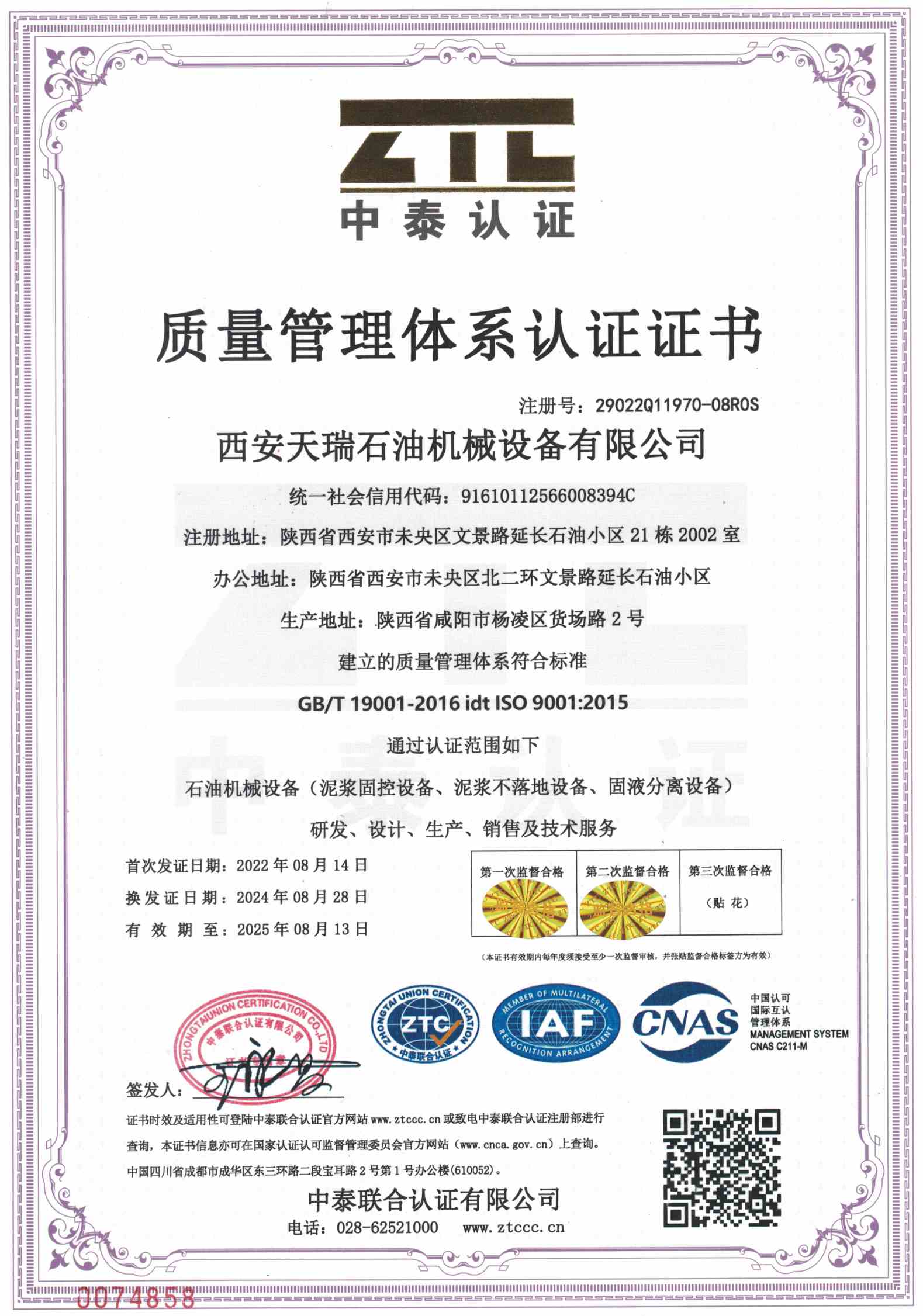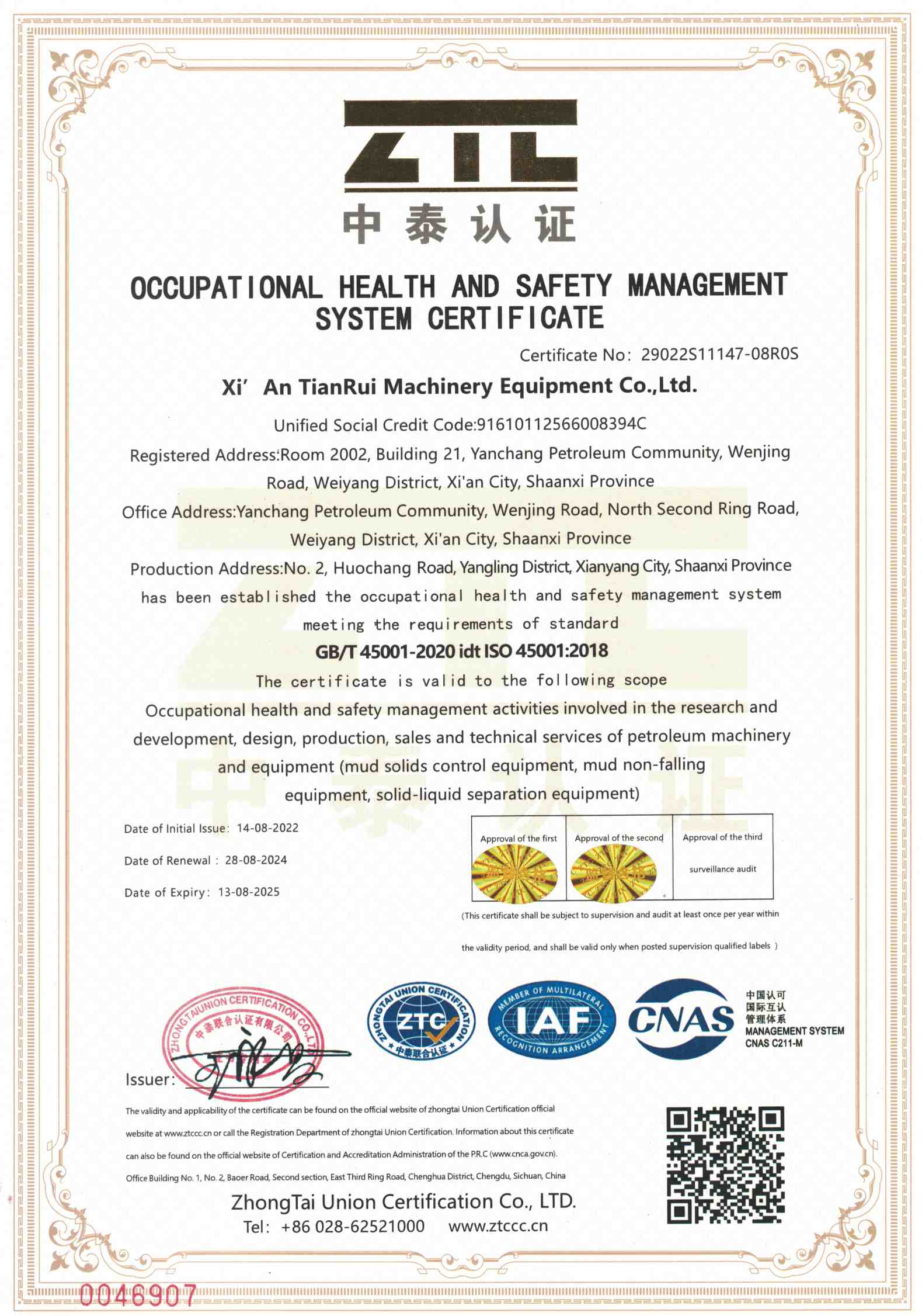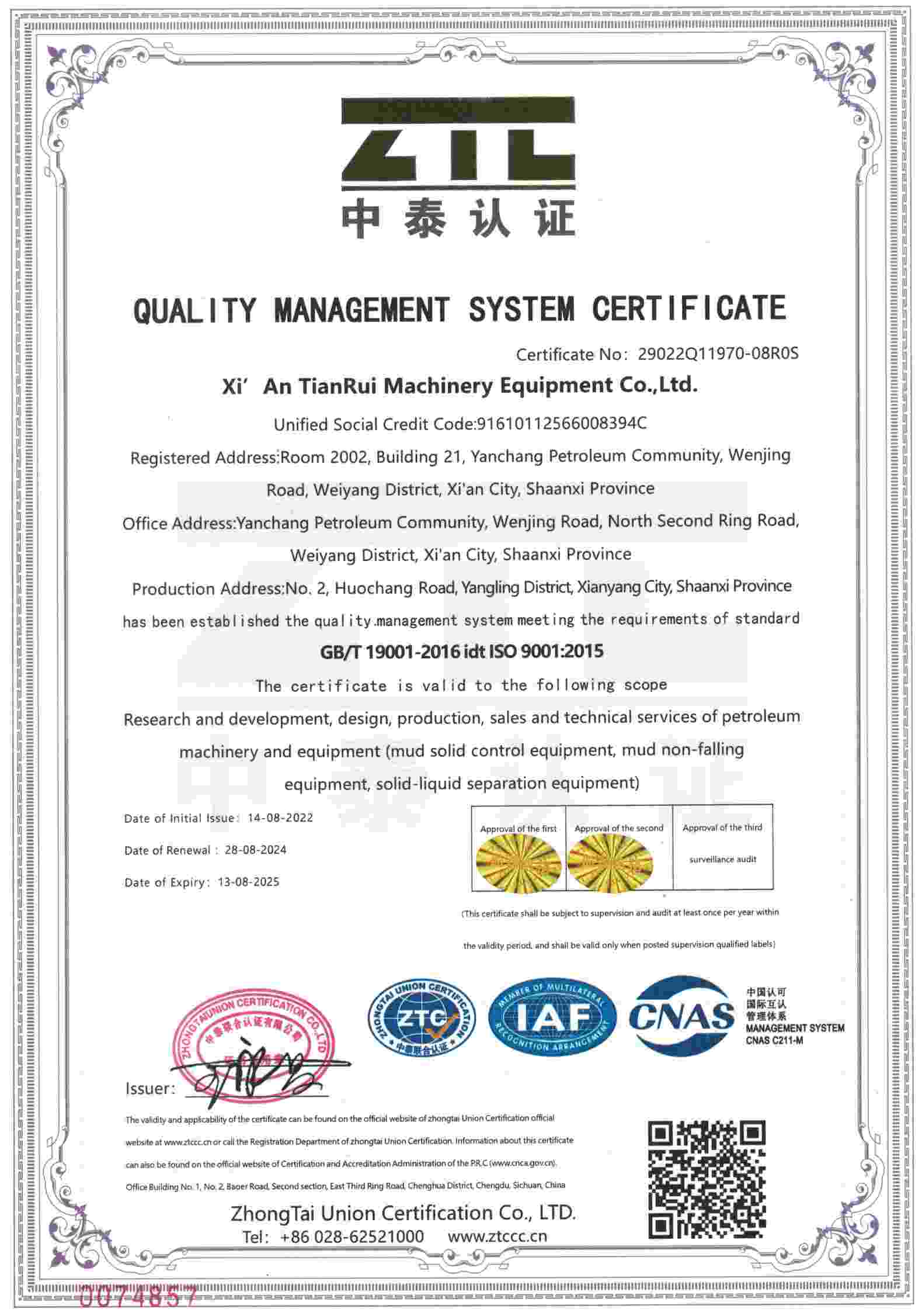 TR focuses on the manufacture of solid-liquid separation equipment, and is an API certified manufacturer integrating research and development, production, sales and technical services. We have provided solid-liquid separation solutions or equipment to customers in more than 60 regions. Since its establishment in 2010, with years of technical accumulation and manufacturing experience, TR and Xi 'an Shiyou University have reached a strategic cooperation, started the research and development of solid-liquid separation equipment, solved a number of customer technical problems, has obtained and is applying for a number of patents, and passed the American Petroleum Institute API and China IS09001 quality certification.